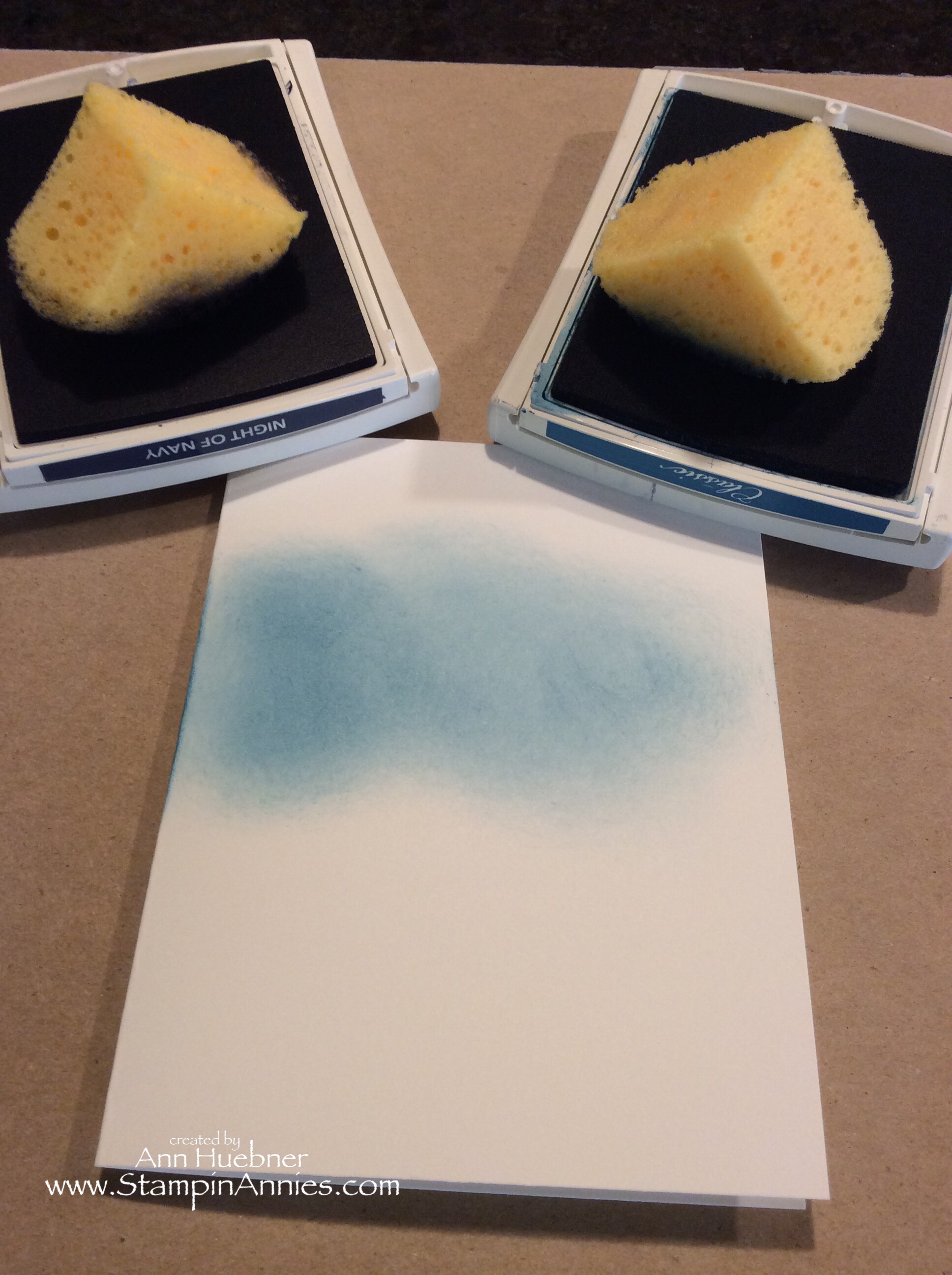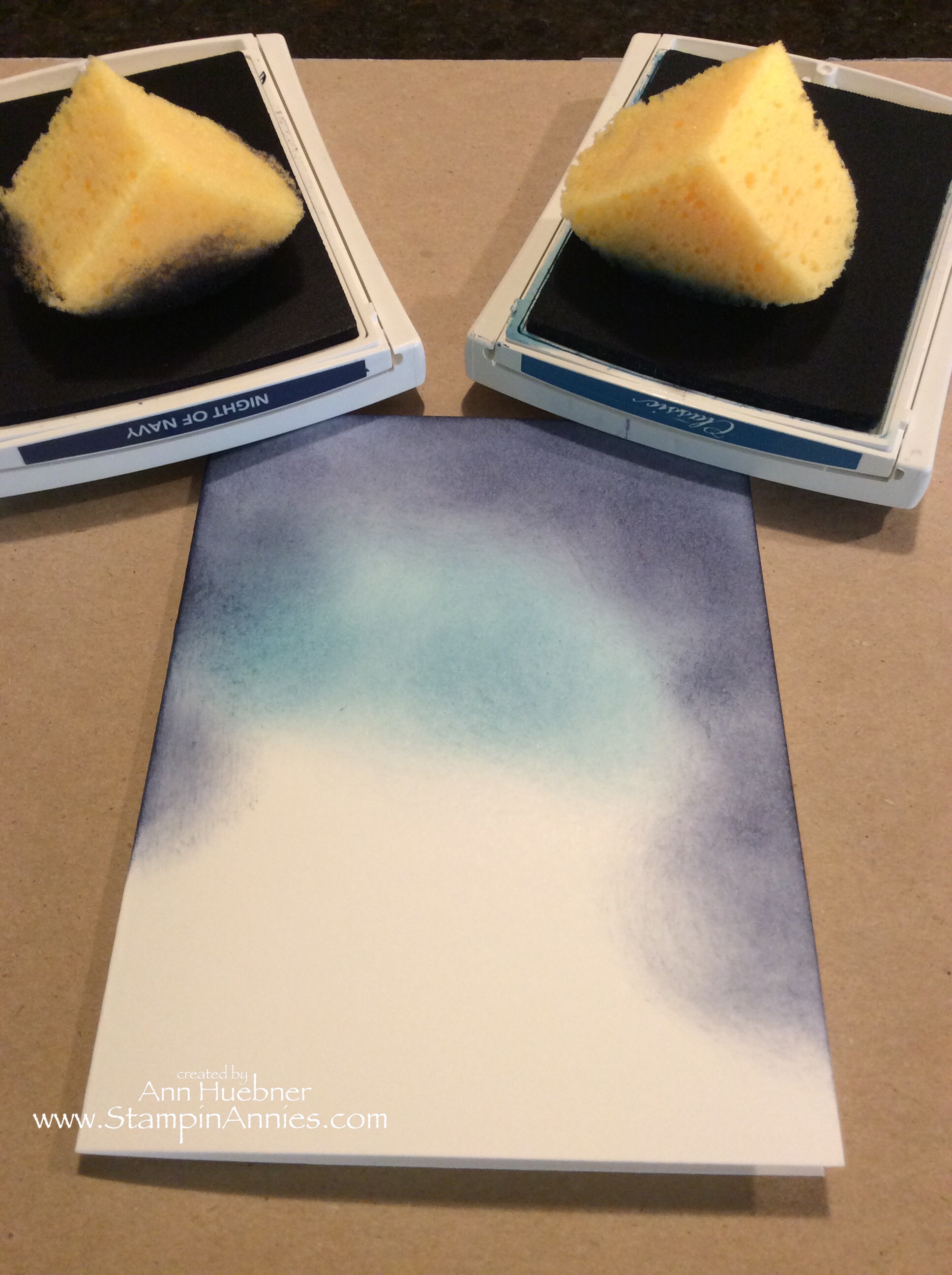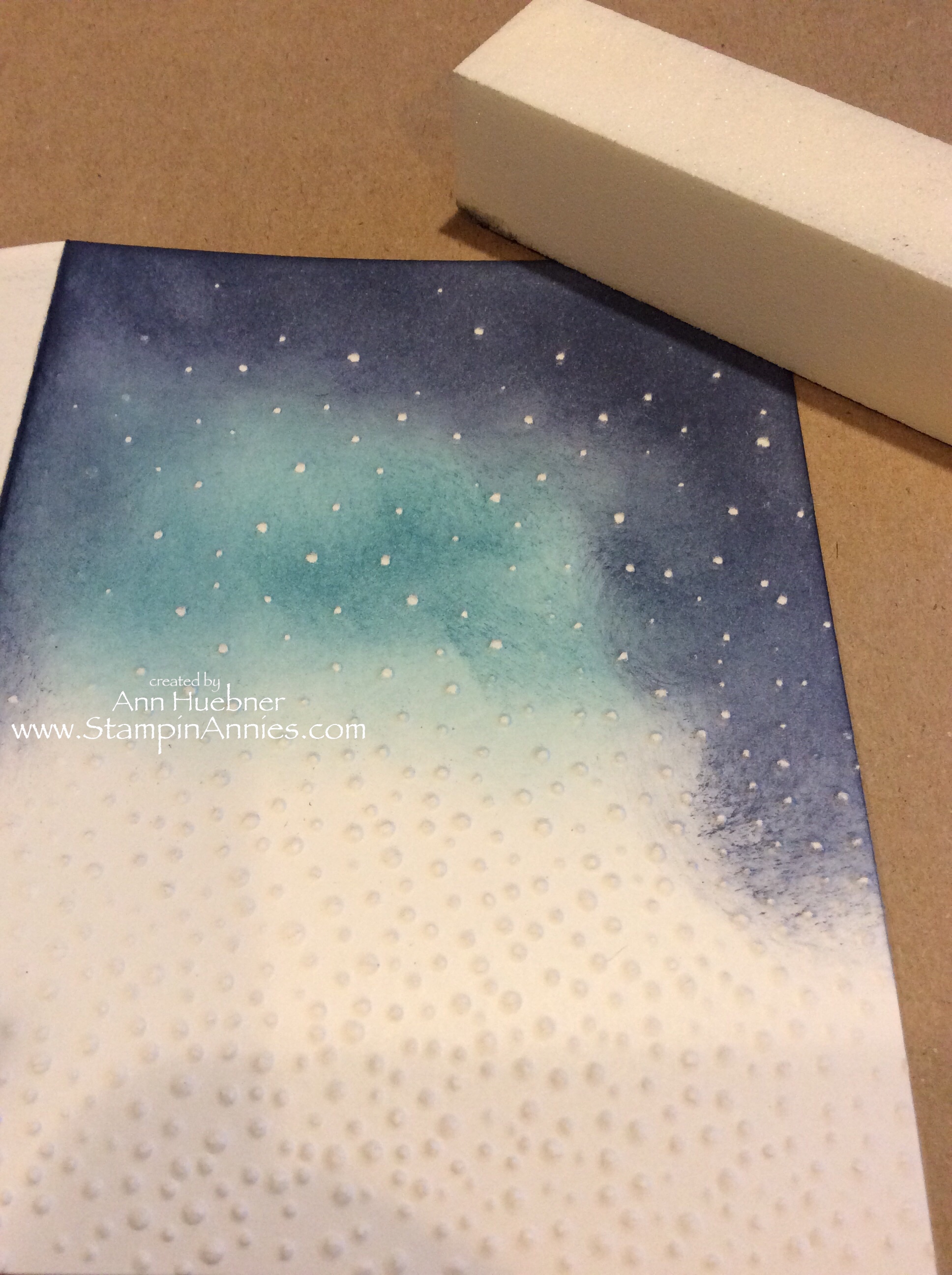 I was so excited to figure out this card!!! I don’t do videos, but I hope these step-by-step pics will help show you how to create your own snowy or starry evening cards. To start, I used Whisper White cardstock as the base card, then used Night of Navy ink and Island Indigo ink to create the beautiful evening sky. Use a sponge with the Island Indigo ink, first, followed by the Night of Navy. No need to do the whole card as you will be covering it up with your skyline and sleigh.