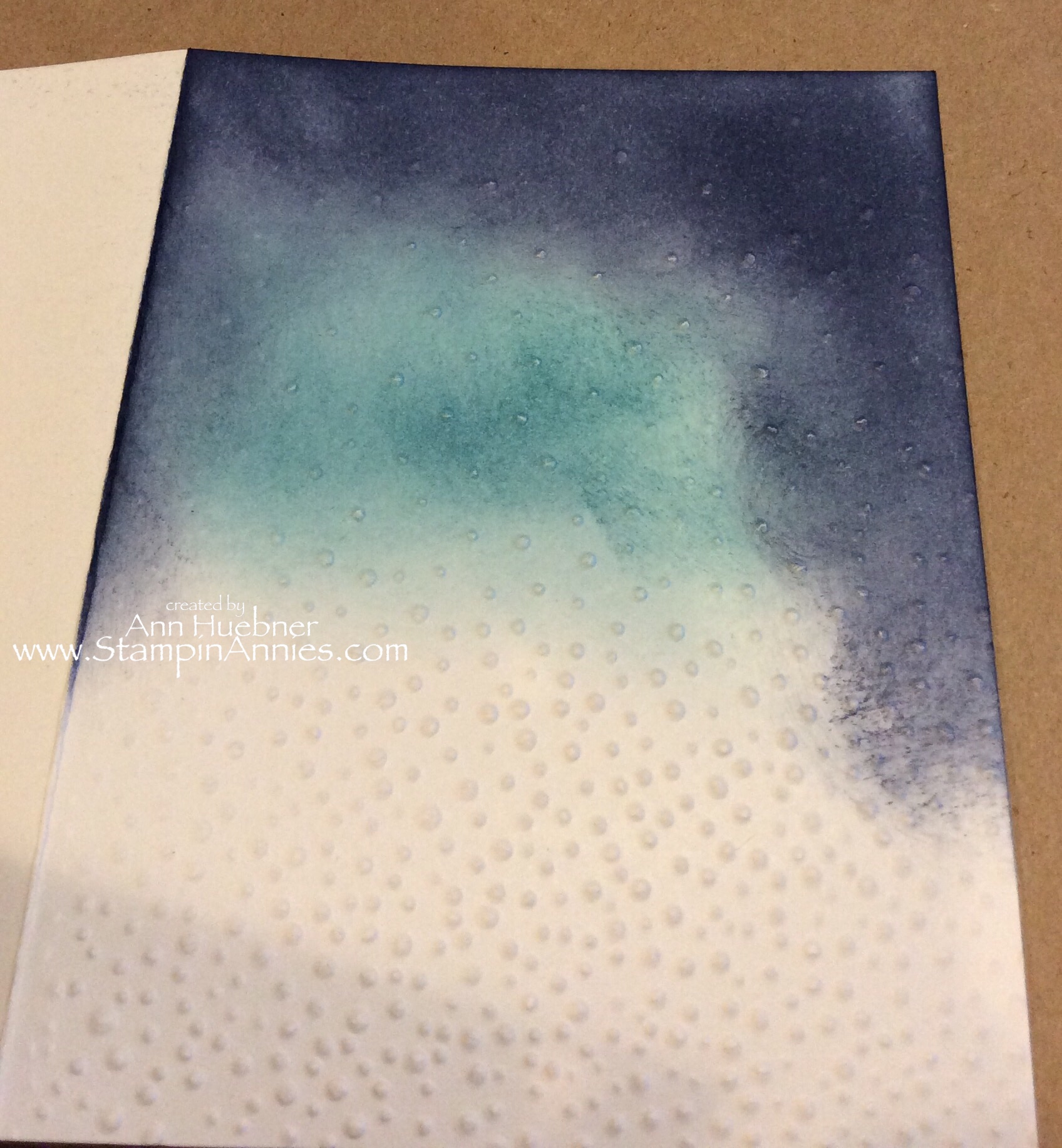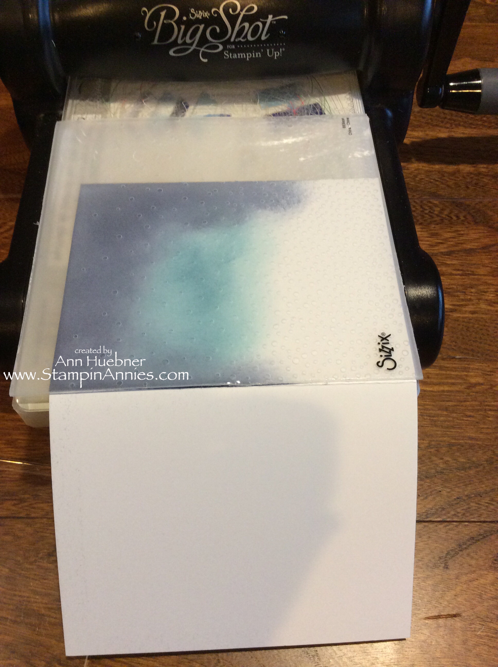 After you are done sponging, place your card into the Softly Falling Embossing folder (#139672)… Notice on this pic that the ‘Sizzix’ name is showing on top and your sponged area is up! This will give your the nice raised dots on the correct side.