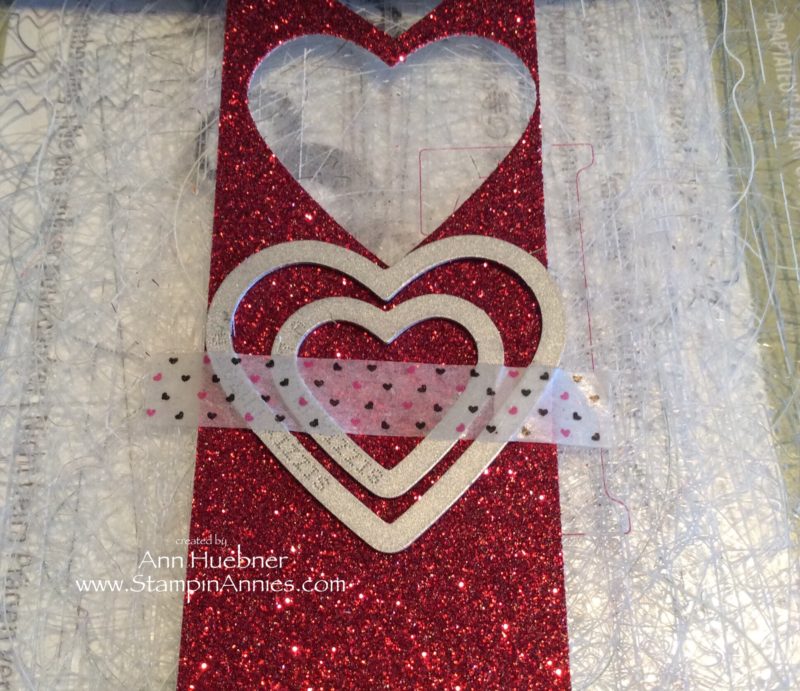Here’s a fun little tip… Use Washi tape to keep your nested dies together… Here I used two hearts from the Sweet & Sassy Framelits set of 15 heart dies. I needed several hearts to use in my classes, so I used washi tape to hold the hearts together and also to hold them down to the cutting mat. The Washi Tape held up for about 8 hearts before it cut thru and I had to replace it. The Cutting edge of the dies are typically on the inside edge, so if you see the die hanging over the edge of the paper, it’s fine.
