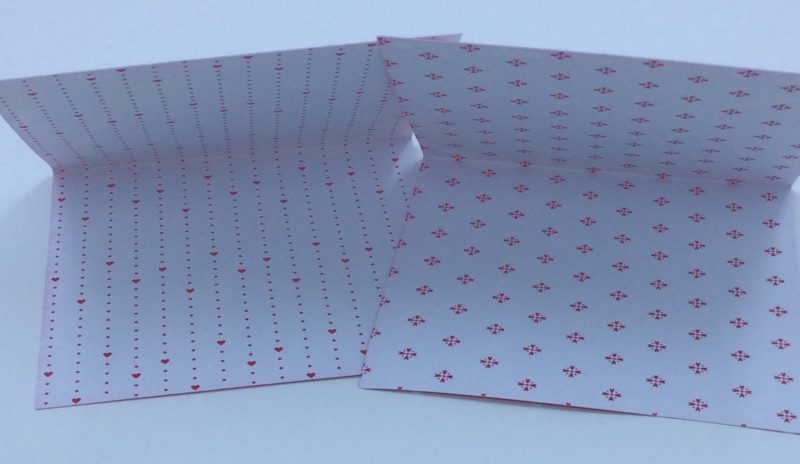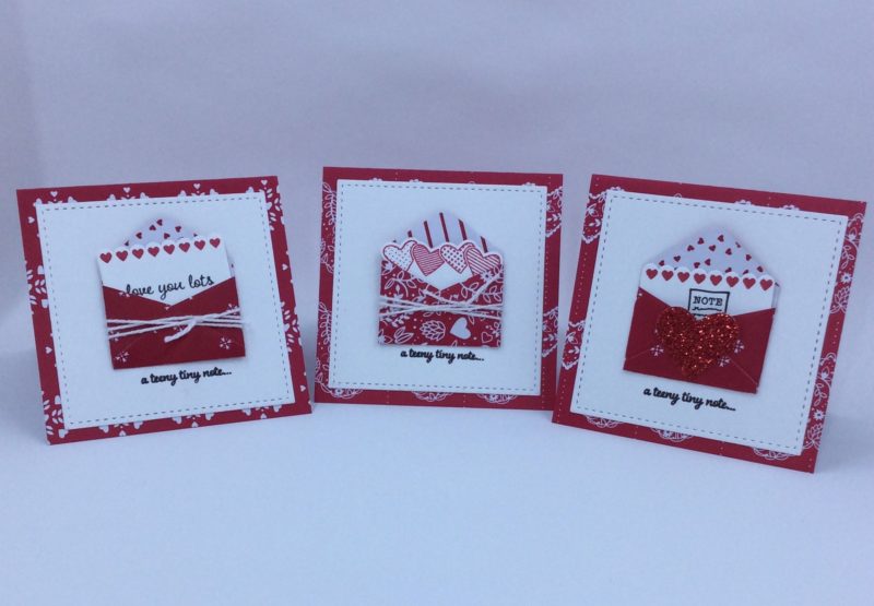 The actual size of this adorable little Valentine is 3″ x 3″. The mini envelope and note have been created using dies from Love Notes Framelits Dies. And by using the double sided Designer Series Paper, look how cute the inside looks!