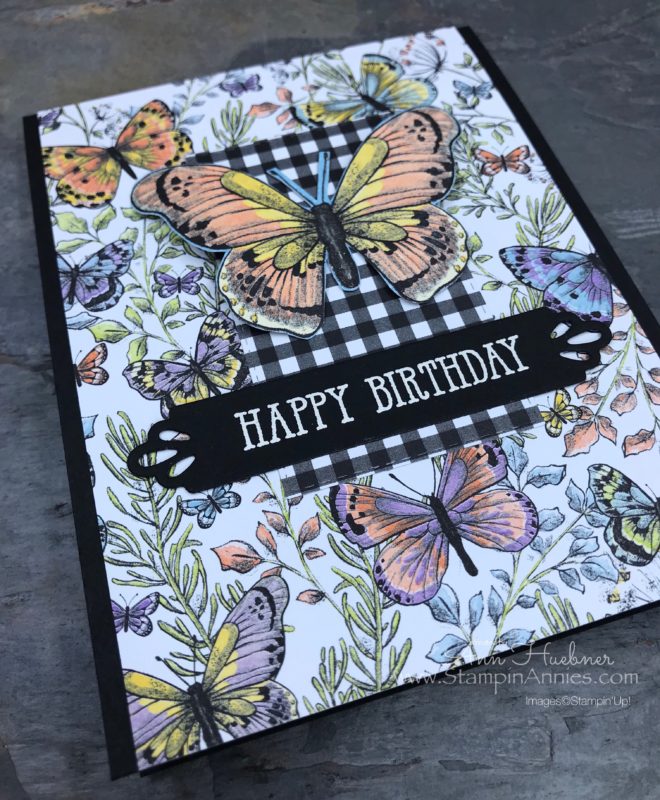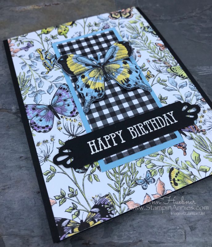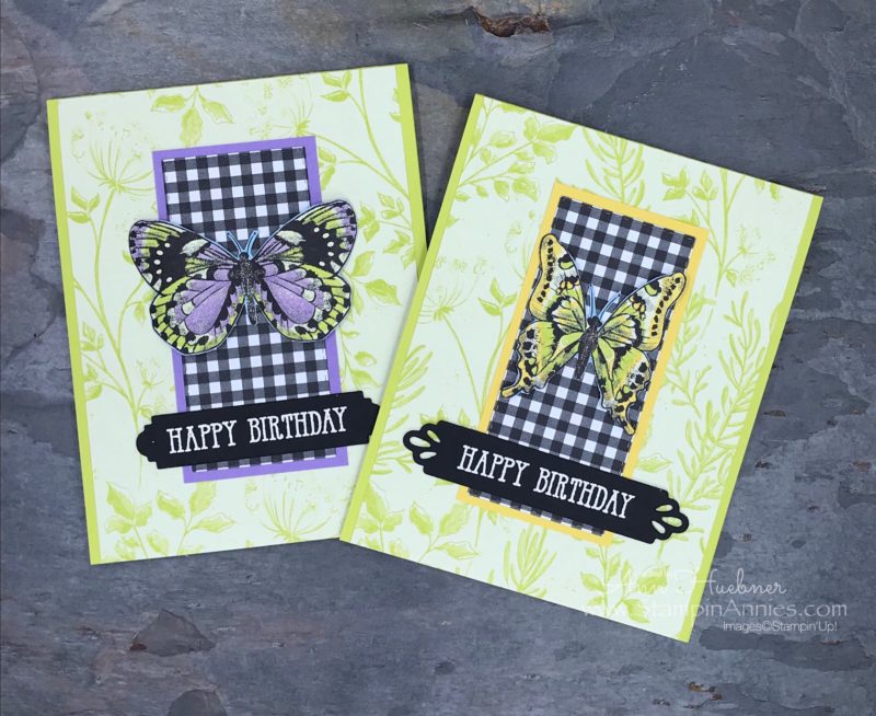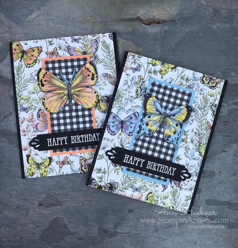 Today’s cards are made by fussy cutting the large butterflies from the first sheet shown above. Several sheets are designed to use with our Butterfly Duet Punch, available April 1st! (yes, due to popularity it is currently sold out). Don’t wait around for this paper… only available through March, 2019. You can always add the punch – available through June.